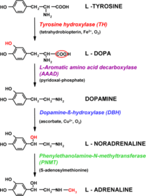 | Rate limiting step? | Tyrosine hyroxylase converting Tyrosine to DOPA (Dihydroxyphenylalanine) |