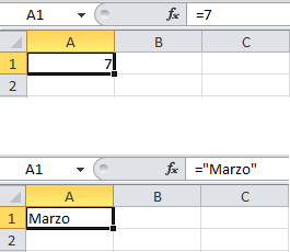 Una celda contiene el símbolo igual y esa celda muestra el resultado de la operación, mientras que la otra celda solamente muestra el texto de la ecuación pero no realiza ningún cálculo. Partes de una fórmula de Excel Todas las fórmulas de Excel consisten de cualquier de los siguientes elementos: Constantes o texto. Un ejemplo de una constante es el valor 7. Un texto también puede ser utilizado dentro de una fórmula pero siempre deberá estar encerrado por dobles comillas como “Marzo”.