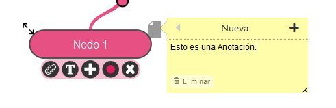 2. Primeros pasosLo primero que ves al entrar en el generador de Mapas Mentales es el nodo central. Haz click en él e introduce tu texto. Éste será el nombre de tu Mapa Mental (no te preocupes, podrás cambiarlo posteriormente).Cuando haces click en un nodo, verás una pequeña barra de herramientas en la parte inferior, con las siguientes opciones: Icono +: Si arrastras el icono “+” desde el nodo central, podrás crear un nuevo nodo. Este está conectado el principal por una delgada rama. Icono T: El icono “T” controla el texto dentro del nodo; puedes hacerlo más grande, ponerlo en negrita, cursiva o cambiar su color. Círculo Coloreado: El círculo coloreado te permite cambiar el color de un nodo y cualquier nodo asociado. Usa el deslizador para seleccionar tu color. Icono X: El icono “x” elimina el nodo y cualquier nodo conectado al mismo. Icono Clip: El icono del clip te permite adjuntar cualquier recurso a un nodo para poder acceder al mismo fácilmente. Puedes adjuntar otro Mapa Mental, un conjunto de Fichas, un Juego de Preguntas o un Apunte. Apunte: También puedes adjuntar una Anotación, algo así como un pequeño post-it. Haz clic en el icono del cuaderno para crear una anotación. Puedes crear tantos nodos como quieras y usar diferentes formas, colores y tamaños.