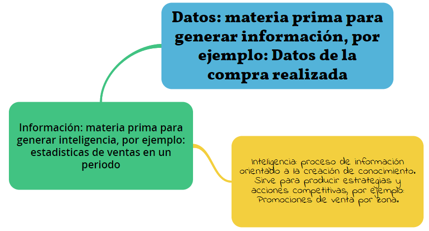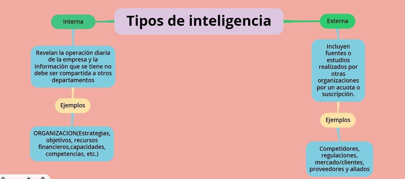 Inteligencia de negocios se conforma por elementos de informacion que pasan por un proceso organizados filtrados reducidos refinados analizados. Este proceso facilita a los miembros de una empresa, tomar una decision. En una empresa...•Producción de inteligencia en una organización nunca termina.•Las necesidades de inteligencia son cambiantes. •Es continuo el incremento de las personas que requieren inteligencia. •Toda producción de inteligencia está en función de factores cambiantes: internos y externos. Inteligencia interna Es la conversion de informacion relacionada con la parte interna de la organizacion. las competencias. Inteligencia externa Conversión de información que describe ampliamente el ambiente donde compite una organización.Se refiere a Proveedores competidores mercado clientes regulaciones aliados. Existen 2 Tipos de fuentes. Primarias y secundarias. Fuentes Primarias •Poseen datos e información que no han sido cambiados o manipulados por un tercero. •Información que se encuentra exactamente como se recopila. •Ej. Registro de los datos directos de las transacciones realizadas (ventas, compras); reportes financieros de la compañía, entrevistas, etc. Fuenetes secundarias •Ofrecen información que ha sido obtenida de información primaria. •Ha sido cambiada por la opinión de analistas o expertos en el ramo. •Ej. Artículos o noticias del periódico, artículos en revistas, boletines por televisión o radio, etc. Inteligencia Competitiva Busca tener conocimiento de los factores competitivos de la organización: Clientes actuales y potenciales Distribuidores y proveedores Tecnología Cambios sociales Regulaciones Competidores Economía nacional e internacional Productos y/o servicios sustitutos Aspectos demográficos Inteligencia de Negocios La inteligencia de negocios es una estrategia que involucra a toda la empresa en todos los niveles administrativos.Es la transformación de datos en conocimiento para obtener una ventaja competitiva