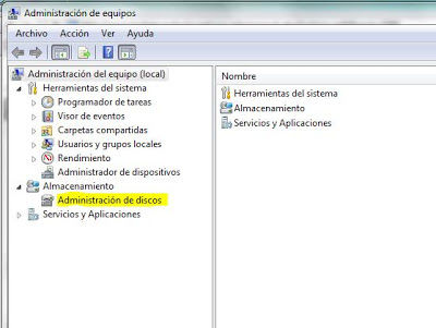 >>Luego damos clic en Herramientas Administrativas donde dice crear y formatear particiones del disco duro y nos saldra una ventana administrador de discos.