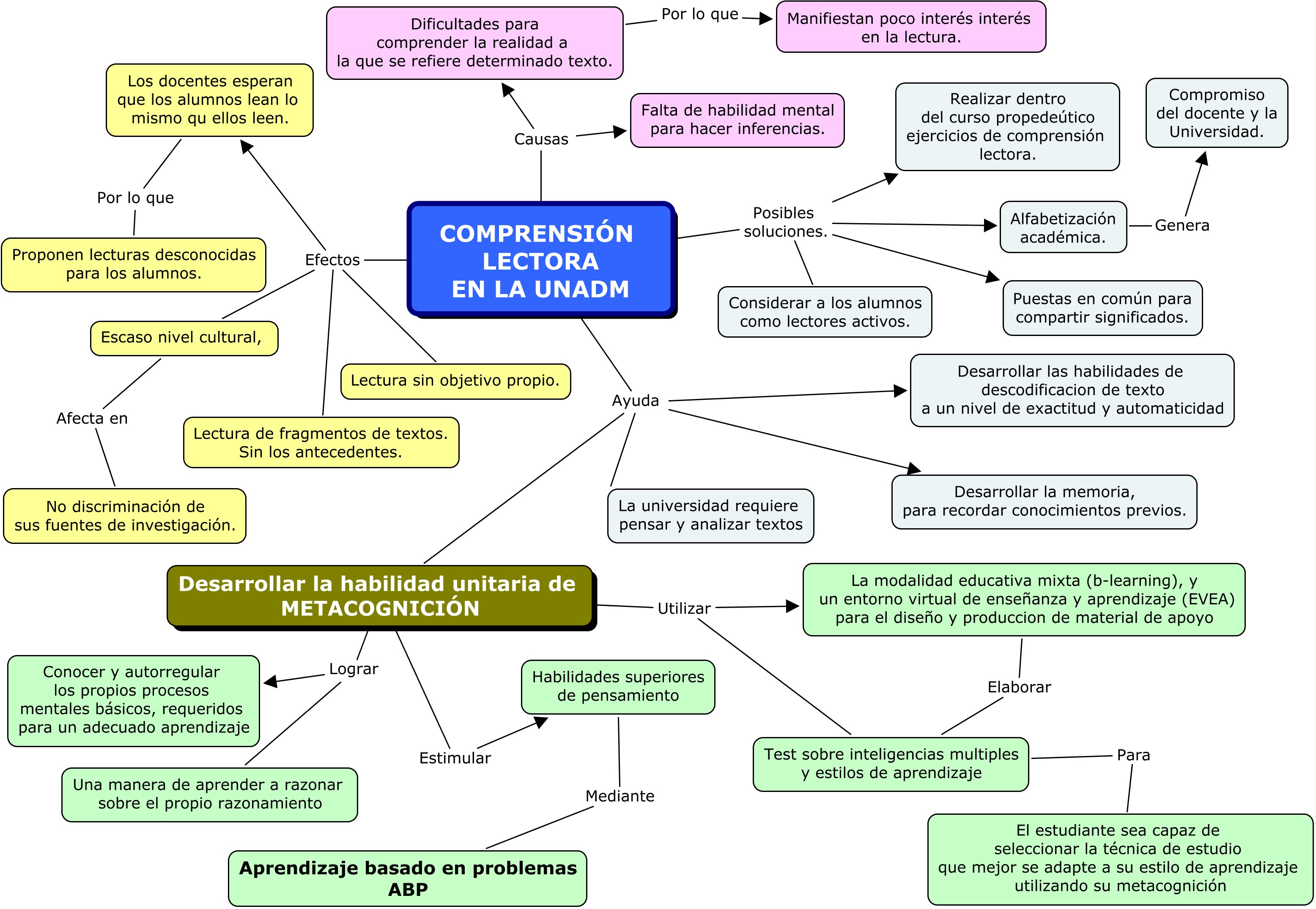 Lectura de comprensión desarrolla la MetacogniciónProblemas que enfrentan los alumnos del siglo XXI: 1.- El alumno no es consciente de su proceso de aprendizaje y cómo modificarlo. 2.- Diferencias muy marcadas entre los alumnos, por la diversidad de conocimientos previos (aprendizajes significativos anteriores a la universidad). Efectos: 1. Dificultad para elaborar inferencias. 2.- La prosa técnica o textos científicos son totalmente nuevos para el alumno universitario. 3.- El alumno tiene dificultades para organizar la nueva información en sus esquemas anteriores mentales. También le implica dificultad para saber cómo solucionar este ajuste mental. 4.- Pocas veces el alumno tiene conciencia de que no entiende un texto. 5.- La baja destreza cognitiva da lugar, por reflexión, a un conocimiento metacognitivo pobre sobre la propia competencia y ello redunda en una reducida motivación que no ayudará a afrontar nuevos aprendizajes de forma óptima. Soluciones: 1.- Adecuar el texto a los esquemas mentales de los alumnos. Para ello se debe hace más explícita la información, evitar inferencias. 2.- Trabajar el currículo con destrezas de habilidades mentales. 3.- Volver a trabajar ejercicios de memorización, con el fin de que el alumno conecte los conocimientos pasados con los nuevos. 4.- Motivación constante y orientación docente sobre la forma de abordar los nuevos conocimientos.Metacognición y comprensión lectora Por lo que corresponde a comprensión lectora las investigaciones (Echevarría y Gastón 2000; Cisneros, Olave y Rojas, 2012 ) reportan: · Lectura superficial. · Dificultad para identificar el tema global · Nula o escasa identificación de la unidad de texto. · Dificultad para correlacionar conocimientos (nuevos y previos). · Dificultad para elaborar material (propio). También hay que mencionar que de acuerdo con Echevarría y Gastón (2000 ), esta no es una práctica que tenga efecto solo en el nivel básico, sino que es una deficiencia del sistema educativo, al menos en América Latina, que se va pasando como una tradición, hasta llegar al nivel superior. Cabe mencionar que el problema no para en este nivel educativo ya que la evidencia empírica (Cisneros, Olave y Rojas, 2012) muestra que, la dificultad en la comprensión lectora también está presente en los estudiantes de los últimos semestres del nivel superior (ello al continuar utilizando la paráfrasis o/y la copia literal). Si la comprensión lectora actúa como un sustento significativo para la adquisición de nuevos conocimientos, luego entonces cómo se espera que los alumnos gesten un conocimiento significativo, si carecen de las herramientas básicas? Es por ello, primordial enseñarles a los alumnos a aprender a aprender... este proceso esta guiado, entre otros factores, por la metacognición (Osses y Jaramillo, 2008). Misma que se refiere al proceso de aprendizaje, en donde el estudiante es consciente de su aprendizaje y del proceso autorregulación (deliberada del mismo). Con relación a la comprensión lectora, Brown (1990) (citado en Cisneros, Olave y Rojas, 2012) la metacognición es "la capacidad para planificar estrategias y formas de acercamiento al texto para favorecer la comprensión, así como la capacidad de supervisar y evaluar el nivel de comprensión, decidir cuando es o no adecuado y emprender, continuar o terminar acciones para modificar esa comprensión. " Es así que la metacognición es vital para comprender y mejorar los procesos de lectura, especialmente en el nivel superior, ya que, ayuda a la incorporación y construcción del conocimiento de los futuros profesionistas. Por lo que es necesario concientizar a los alumnos sobre la importancia de propiciar su conocimiento (aprendizaje autónomo) siendo ejes principales en su camino al aprendizaje .