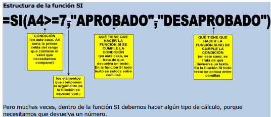 Funciones lógicas: SI La función SI es una función lógica que, tal como su nombre lo indica, implica condiciones. Es decir que frente a una situación dada (condición) aparecen dos alternativas posibles: -si se cumple la condición, la función debe devolver algo (un número o una palabra) -si no se cumple la condición, la función debe devolver otra cosa (un número o una palabra.