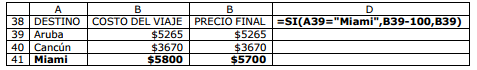 Analizamos: Se plantea la condición. Como se trata de comparar una palabra solo admite el signo igual y el texto va entre comillas. Al costo del viaje se le restan $100, que es lo que debe hacer si la condición se cumple. Si la condición no se cumple (es decir, si no encuentra la palabra "Miami") se repite el valor de la celda del costo del viaje.