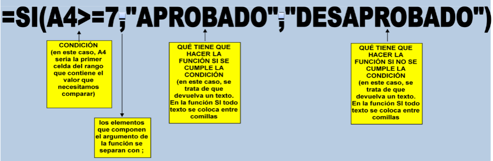 Función SILa función SI es una función en excel que demuestra comportamientos lógicos, dependiendo de el valor que obtenga , verdadero o falso, así podiendo devolver distintos valores que se obtengan al ejecutarse, Se ejecuta para pruebas condicionales, que suelen ser valores, pero también pueden ser formulasEn pocas palabras, La función requiere de que se cumpla una condición para poder arrojar un resultado específico Entonces si en la condición se especifica un valor o dato, arrojará un resultado y de lo contrarío arrojará otro distinto, distinguiendose de valor falso y verdadero