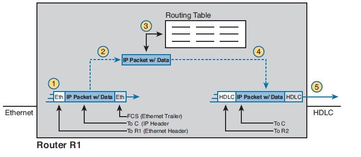 IP routing—the process of forwarding IP packets—delivers packets across entire TCP/IP networks, from the device that originally builds the IP packet to the device that is supposed to receive the packetThe complete end-to-end routing process relies on network layer logic on hosts and on routers. The sending host uses Layer 3 concepts to create an IP packet, forwarding the IP packet to the host’s default gateway (default router). The process requires Layer 3 logic on the routers as well, by which the routers compare the destination address in the packet to their routing tables, to decide where to forward the IP packet next.The router receives a frame, removes the packet from inside the frame, decides where to forward the packet, puts the packet into another frame, and sends the frame.