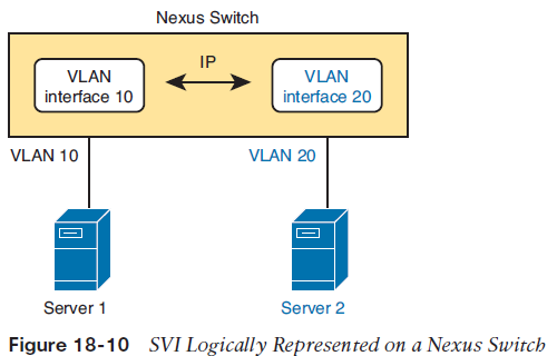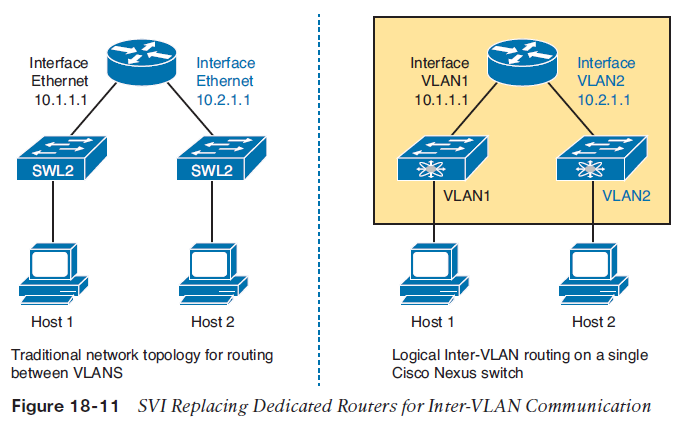 Cisco Nexus Switch Operations with RoutingA multilayer switch is essentially a switch at Layer 2 that has routing functionality.Multilayer switches traditionally have been built to give you the ability to have multipleVLANs on a given switch and route between them if needed without the need for an externaldedicated router.Switches use ASICs to provide forwarding in hardware to accelerate the process of packet switching and routing, in comparison tothe original routers, which did this primarily in software.The second major difference between multilayer and Layer 2 switches is based on how routing is implemented or configured on them. On a Layer 3 switch, you can implement a switched virtual interface (SVI) or a Layer 3 routed interface (sometimes referred to as a router port).The first thing to understand is how a Cisco Nexus switch implements the logical routed interface known as an SVI and when you would want to use it in you data center. Figure 18-10 shows what an SVI looks like logically in a Nexus switch