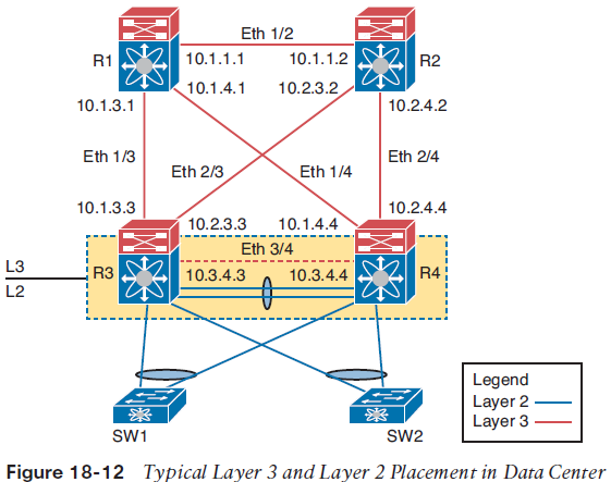 Now with Cisco Nexus switches being able to perform both routing and switching simultaneously, you can enable SVIs or logical routers on them and allow for inter-VLAN routing without having to go to another external device. The typical use case for this in the data center is at the distribution or access layer, where you need to do inter-VLAN routing and support many downstream Layer 2 networks at the same time, as shown in Figure 18-12.In Figure 18-12, we would enable SVIs on R3 and R4 for any Layer 2 networks below them or off of SW1 and SW2. This allows for multiple devices to join these networks by being assigned to a VLAN and for inter-VLAN communication to happen at R3 and R4.The question that now usually gets asked is this: “When do I use an SVI versus a routed interface?” We have answered this question already, but let’s now review when it might be good to use them and look at a few considerations when using an SVI or a routed interface.The SVI is most useful when we need to support Layer 2 and Layer 3 simultaneously for a given subnet. You’re probably wondering what that means. If you refer to Figure 18-12, in a typical data center design we have an aggregation layer where all the Layer 2 connected devices live, but we need to provide default gateways for them as dedicated routers normally would if connected to a switched network in the past. Using an SVI here lets us run Layer 2 protocols such as Spanning Tree Protocol (STP) and run a logical router that acts as the default gateway for a VLAN or many VLANs. (Each VLAN has its own logical router or SVI interface.) This enables us to add devices to this Layer 2 network and point them to their gateway (SVI or logical router) to talk to other networks.