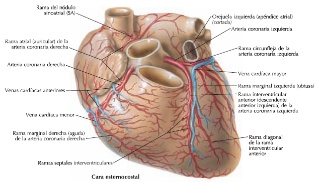 Está dividida, por el surco coronario, en dos segmentos: inferior (ventricular) y superior (auriculo-vascular). El segmento inferior, más extenso, corresponde a los ventrículos y está recorrido por el surco interventricular anterior (surco descendente anterior), que surge del surco coronario y desciende hasta la punta cardíaca, donde forma una pequeña muesca (escotadura cardíaca) por dentro del verdadero vértice del corazón. El surco corresponde en profundidad al tabique interventricular y delimita dos campos ventriculares en esta cara; dos tercios corresponden al ventrículo derecho y un tercio al ventrículo izquierdo.El segmento superior presenta, en el medio, el origen de los grandes vasos arteriales que salen del corazón: la aorta y el tronco de la pulmonar. Este pedículo vascular está circunscrito por detrás por el surco coronario, que le separa de las aurículas. El origen de los grandes vasos sedispone de forma que el tronco de la pulmonar se sitúa por delante y a la izquierda de la aorta. Por detrás y a los lados de los grandes vasos, encontramos la porción auricular, constituida por la cara anterior de las aurículas y las orejuelas.Las aurículas forman una excavación que recibe a los grandes vasos, y se prolongan a los lados y por delante de éstos mediante las orejuelas, unos sacos de bordes irregulares que comunican con las aurículas. La orejuela derecha bordea el flanco derecho y anterior de la aorta hasta el surco coronario, y la orejuela izquierda contornea el origen de la pulmonar. Un surco estrecho y mal dibujado, el surco interauricular anterior, indica la zona de separación de ambas aurículas.