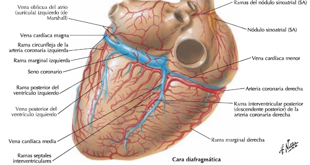 Esta cara se apoya sobre el diafragma, especialmente sobre el centro tendinoso. Corresponde enteramente a los ventrículos, encontrándose delimitada de la base cardíaca por la parte posterior del surco coronario. Está recorrida por el surco interventricular posterior, que desciende desde el surco coronario hasta la punta del corazón y, por medio de la escotadura cardíaca, se continúa con el surco interventricular anterior; el origen de este surco forma con el surco coronario la denominada cruz cardíaca.