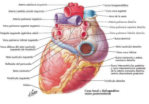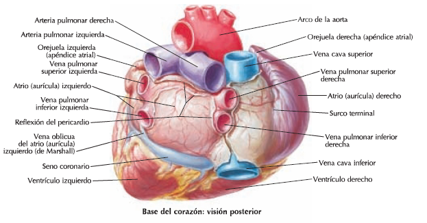 Está orientada hacia atrás y hacia la derecha y corresponde a las aurículas. Es en realidad la verdadera superficie posterior del corazón. La aurícula derecha tiene el aspecto de un saco alargado verticalmente en razón de la entrada de las venas cavas: por arriba recibe la desembocadura de la vena cava superior y por abajo la de la vena cava inferior. Uniendo los flancos derechos de las venas cavas se encuentra el surco terminal (surco de His), una huella embrionaria que marca la separación de la aurícula del primitivo seno venoso. La aurícula izquierda tiene forma de saco alargado horizontalmente, pues recibe, por un lado, las dos venas pulmonares derechas y, por el otro, las dos venas pulmonares izquierdas. El surco interauricular posterior, ancho, mal dibujado y lleno de grasa, está oculto, en parte, por las venas pulmonares derechas.