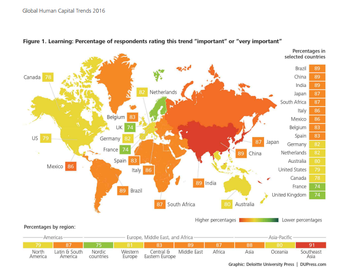 En una encuesta llevada a cabo por 7.000 líderes empresariales y de Recursos Humanos, Deloitte descubrió que 84% de los ejecutivos encuestados opina que la formación es importante (40%) o muy importante (44%).