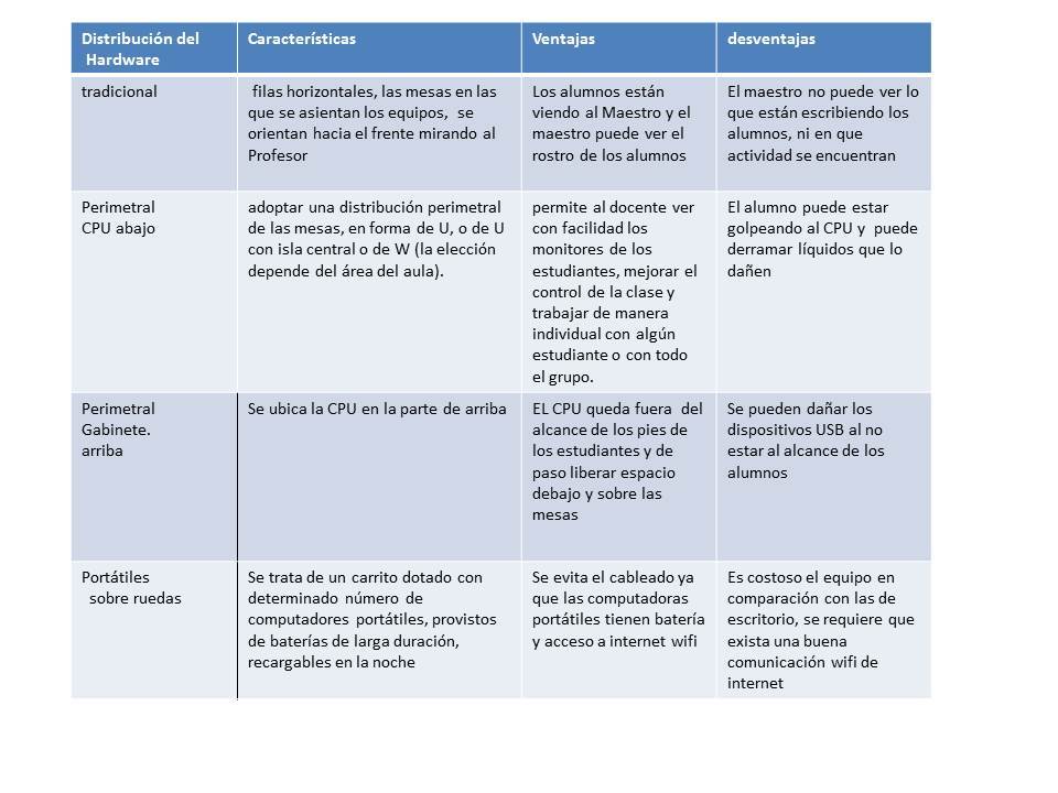 cuadro comparativo sobre las diversas formas de distribuir el Hardware en los salones.