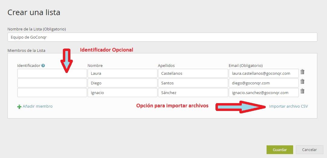 Puedes añadir usuarios de uno en uno o importar listas de usuarios en formato CSV. Una lista de difusión puede contener una mezcla de usuarios y no-usuarios de GoConqr.