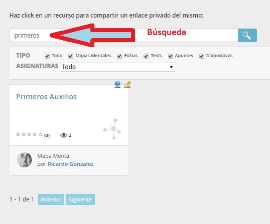 Puedes compartir enlaces privados directamente desde un recurso o desde la pantalla de Enlaces Privados. En este último caso, haz click en la pestaña “Compartir un Recurso” o “Compartir un Curso” y utiliza los filtros que desees hasta encontrar el recurso o curso que buscas.