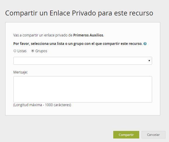 La pantalla de Enlaces Privados tiene cuatro áreas: una para ver los enlaces que ya han sido compartidos, una para ver tus listas y dos para mandar los enlaces (dependiendo de si son recursos individuales o cursos completos).