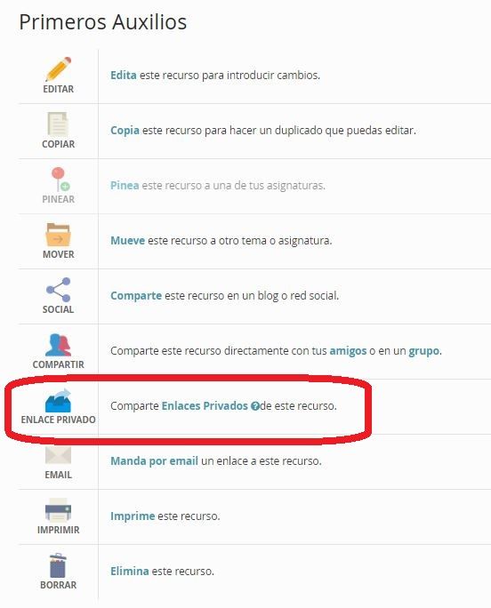 Si lo prefieres, también es posible compartir Enlaces Privados directamente desde los recursos, a través del menú de Acciones. Esta opción solo aparecerá como activa si tienes estos permisos asignados.