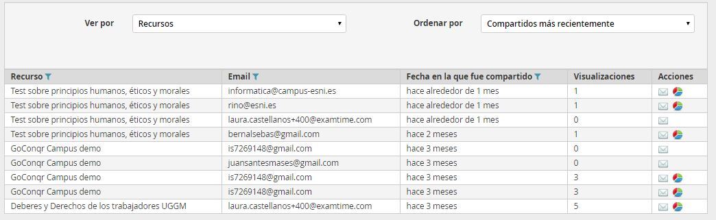En la pantalla de “Compartidos Previamente”, verás los cursos y recursos que has compartido previamente junto con las personas que los han recibido. Puedes ver los resultados por recursos, grupos, listas y grupos (por ejemplo, es posible que hayas compartido el mismo recurso con grupos diferentes y que quieras verlos juntos). También puedes elegir cómo ordenar los resultados: por la fecha en la que fueron compartidos o por la fecha en la que fueron realizados.