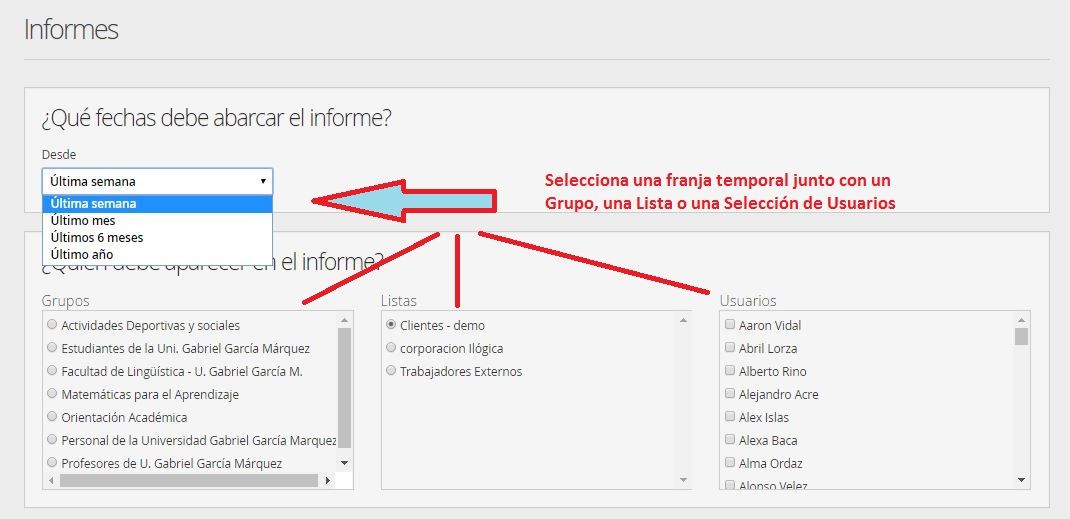 Selecciona la franja temporal adecuada y, posteriormente, elige un grupo, una lista o usuarios individuales para realizar el informe. Nota: Solo verás los grupos de los que eres administrador y las listas que tú mismo has creado.
