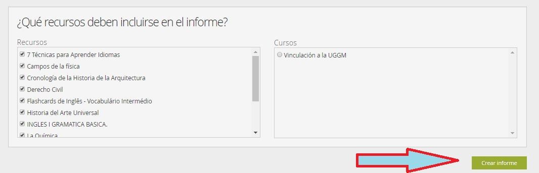 Una vez que hayas seleccionado las fechas y los usuarios, verás los recursos y/o cursos que han sido compartidos con esos usuarios y que han sido visualizados o intentados durante el periodo seleccionado. Por último, simplemente selecciona los recursos/cursos que desees y haz click en el botón “Crear informe”.