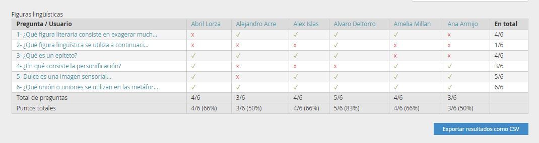 Para el caso concreto de los Tests, los informes te permiten ver exactamente qué preguntas los usuarios respondieron correctamente y cuáles incorrectamente. Puedes hacer click en un usuario concreto para ver información personalizada como, por ejemplo, el tiempo y el número de intentos. Todos estos resultados pueden ser exportados a un archivo CSV.
