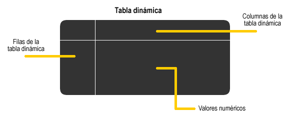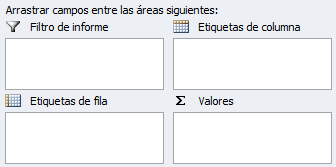 Filtro de informe. Los campos que coloques en esta área crearán filtros para la tabla dinámica a través de los cuales podrás restringir la información que ves en pantalla.Etiquetas de columna. Esta área contiene los campos que se mostrarán como columnas de la tabla dinámica.Etiquetas de fila. Contiene los campos que determinan las filas de la tabla dinámica.Valores. Son los campos que se colocarán como las “celdas” de la tabla dinámica y que serán totalizados para cada columna y fila.