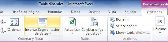 En primer lugar debes hacer clic sobre cualquier celda de la tabla dinámica y posteriormente en la ficha Opciones y dentro del grupo Ordenar y filtrar deberás hacer clic sobre el comando Insertar Segmentación de datos.