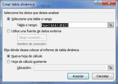 Se mostrará el cuadro de diálogo Crear tabla dinámica. Si es necesario podrás ajustar el rango de datos que se considerará en la tabla dinámica.