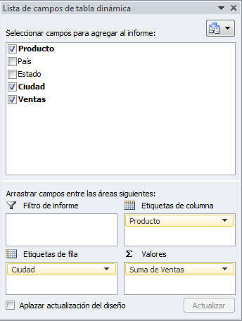 Excel agregará en la parte izquierda del libro la tabla dinámica y en la parte derecha la lista de campos. Esta lista de campos está dividida en dos secciones, primero la lista de todos los campos de los cuales podremos elegir y por debajo una zona a donde arrastraremos los campos que darán forma al reporte ya sea como columna, fila, valor o como un filtro.Para completar la tabla dinámica debemos arrastrar los campos al área correspondiente. Siguiendo el ejemplo propuesto del artículo anterior, colocaré como columna el campo Producto y como fila al campo Ciudad. Finalmente como valores colocaré el campo Ventas.