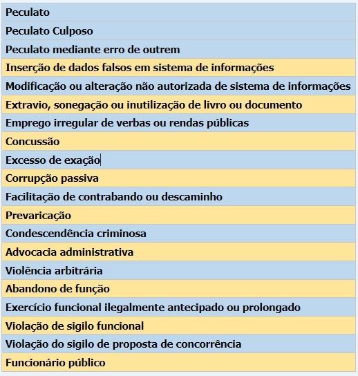 Artigo 312 ao 327 do CP-Especial. Crimes praticados por Funcionários Públicos. Há abreviações de vários termos.