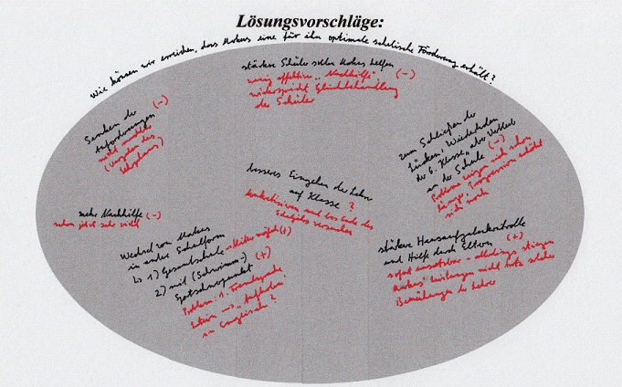 Bereits am Ende der 5. Klasse hatte Frau Berler ein Gespräch mit der Mutter von Markus geführt. Sie empfahl damals wegen seiner schlechten Leistungen insbesondere in Mathematik und Latein einen Schulwechsel oder zumindest ein Wiederholen der Klasse. Markus’ Eltern hatten dem aber nicht zugestimmt und stattdessen einen Nachhilfelehrer für Markus engagiert, der ihn auch gegenwärtig noch in seinen beiden „Problemfächern" unterrichtet. Trotz des Nachhilfeunterrichts hat Markus in beiden Fächern „mangelhafte“ Arbeiten geschrieben, in Mathematik war die letzte Arbeit sogar „ungenügend“. Weil seine Leistungen in Deutsch nur ausreichend sind, sind die Voraussetzungen für eine Versetzung unter den