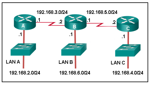 • A(config)# ip route 192.168.4.0 255.255.255.0 192.168.3.2