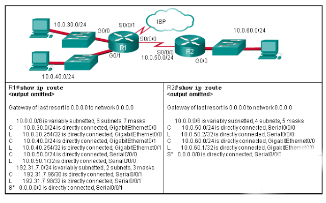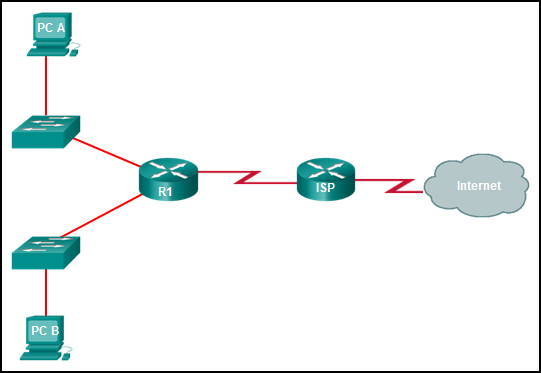 • Configurar una ruta estática de R1 a ISP y una ruta dinámica del ISP para R1.