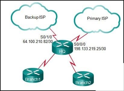 Consulte la presentación. El ingeniero de red para la empresa que se muestra quiere utilizar la ISP connection primaria para toda la conectividad externa. La copia de seguridad de la ISP connection sólo se utiliza si la conexión ISP principal falla. ¿Qué conjunto de comandos sería para lograr este objetivo?