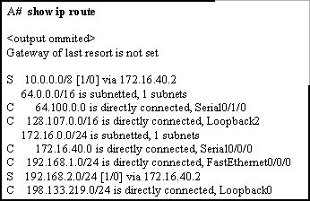 • A(config)# no ip route 10.0.0.0 255.0.0.0 172.16.40.2