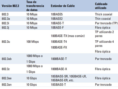 ¿Estas son las velocidades de Ethernet y el medio de cable utilizado, definidos por los diferentes estandares?