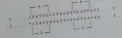 ¿Que región (A a D) de las cadenas de ADN mostradas podría servir como la planilla para la transcripción de la región de un ARNm que contiene el codón de inicio para la traducción de una proteínas de 300 amionacidos de longitud?
