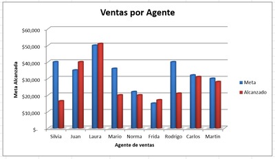 Es una gráfica de columnas en 2D que tiene de título en el eje X "meta alcanzada" y en el Y "agente de ventas" y cuenta con una leyenda del lado derecho.