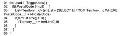 A developer uses a before insert trigger on the Lead object to fetch the Territory__c object where the Territory_c.PostalCode__c matches the Lead.PostalCode. The Code fells when the developer uses the Apex Data Loader to insert 10000 Lead records. The developer has the following code block: (image)