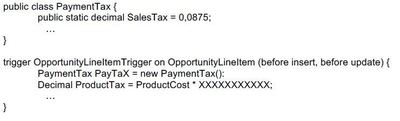 To calculate the ProductTax, which code segment would a developer insert in XXXXXXXXXXX to make the value of the class variable SalesTax accessible within the trigger?