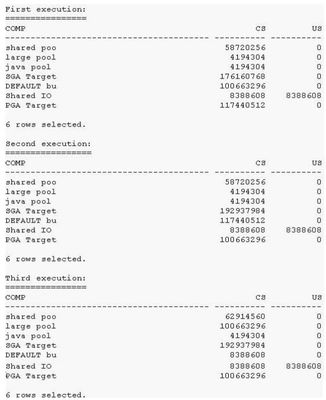 SQL> SELECT substr(component, 0, 10) COMP, current_size CS, user_specified_size US FROM v$memory_dynamic_components WHERE current_size!=0;
