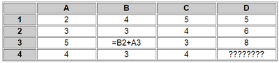 La fórmula =B2+B3 se encuentra situada en la celda B3. Si se copia y pega en D4 el resultado sería: