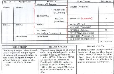 Actualmente tenemos ocho clases de plabras, igual que el esquema de Dionisio de Tracia. Con él tenemos el ónoma (nombre), [blank_start]epirrema[blank_end] (adverbio) -el mésotes de los estoicos-, rhêma (verbo), [blank_start]metoché[blank_end] (participio), árthron ([blank_start]artículo[blank_end]), [blank_start]antonymía[blank_end] (pronombre), [blank_start]próthesis[blank_end] (preposición) y sýndesmos ([blank_start]conjunción[blank_end]). Fijémonos aquí que la categoría adjetivo todavía no aparece aquí. Esto sucede porque es absorbido por el ónoma ya que hasta el siglo XVIII no aparecerá como categoría independiente. El participio es también una categoría que nos llama la atención. Es una categoría que participa del verbo y del nombre ya que proviene de un verbo. Para Prisciano, el número de categorías se mantiene pero sustituyen el árthron por el interiecto.