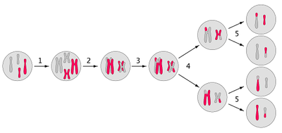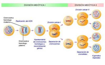 La mitad y cambia el numero comosómico a la mitad.
