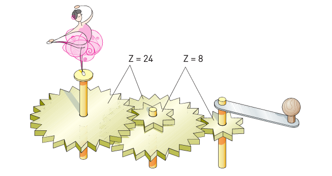 Indica a qué velocidad y en qué sentido girará la bailarina situada en el siguiente conjunto mecánico si hacemos girar la manivela a 90 rpm en sentido horario.