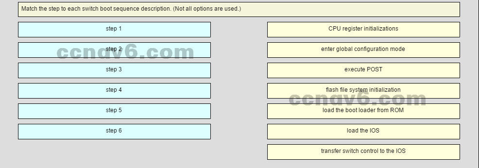 Haga coincidir el paso con cada descripción de la secuencia de inicio del conmutador. (No se utilizan todas las opciones).
