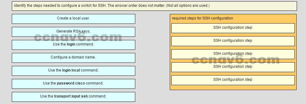 Identifique los pasos necesarios para configurar un conmutador para SSH. El orden de respuesta no importa. (No se utilizan todas las opciones.)