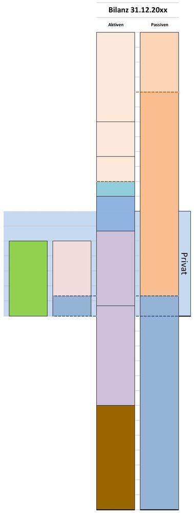 Eigenkapital vom 1.1., Eigenkapitalveränderung, Kasse, Kontokorrent, Verbindlichkeiten, Selbstproduzierte Vorräte, Zugekaufte Vorräte