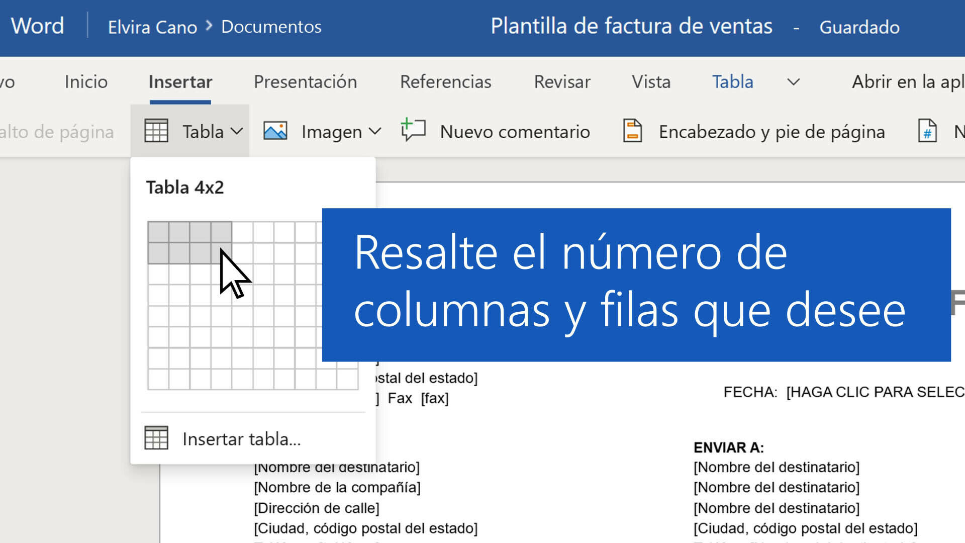 - Seleccione Insertar > Tabla. Resalte el número de columnas y filas que quiera usar y selecciónelas. Para crear una tabla más grande, seleccione Insertar > Tabla > Insertar tabla.