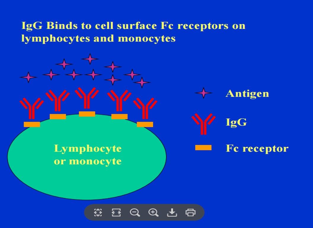 - IgG binds to special Fc receptors on lymphocytes, monocytes and macrophages.